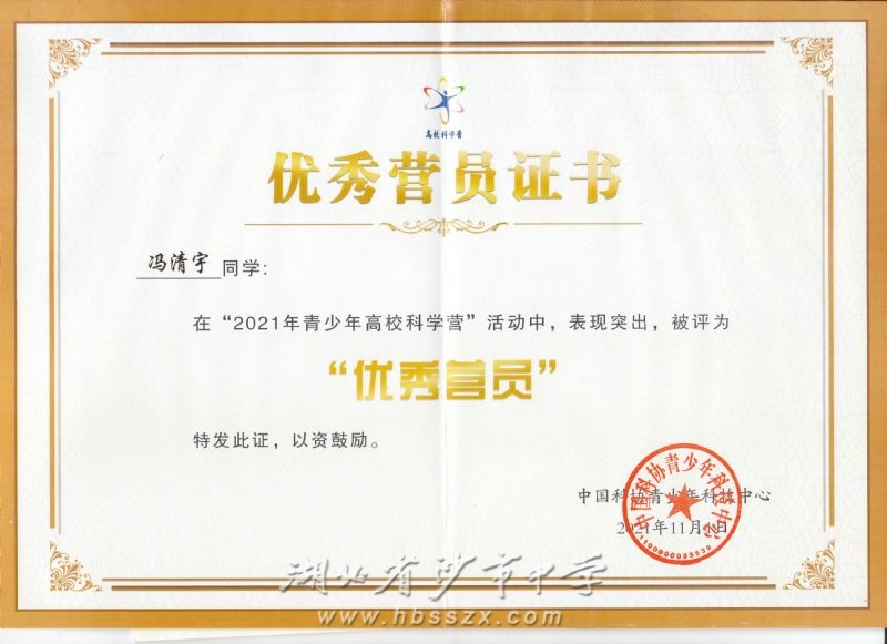 近日,從荊州市科協獲悉,沙市中學高二(4)班馮清宇同學榮獲“2021年青少年高校科學營”全國優秀營員稱號。該榮譽由中國科協青少年科技中心授予,用于表彰在“2021年青少年高校科學營”中成績突出、表現優異的學生。