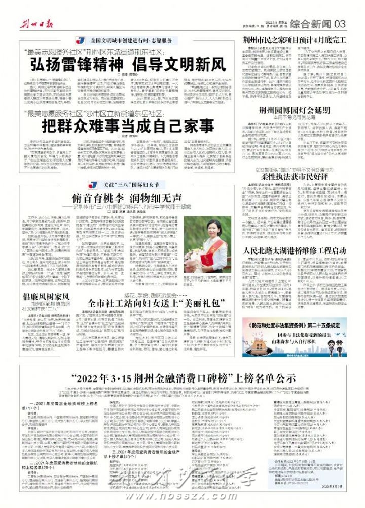 《荊州日報》2022年3月9日報道荊州市巾幗建功標兵、我校教師王翠娥的事跡