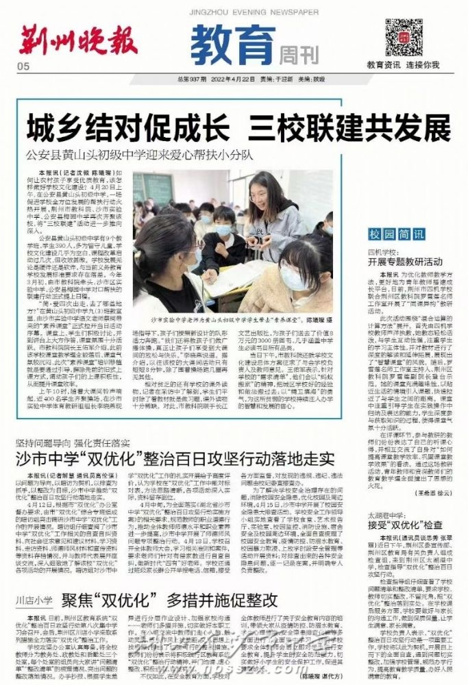 《荊州晚報》2022年4月22日報道我校"雙優化"整治百日攻堅行動落地走實