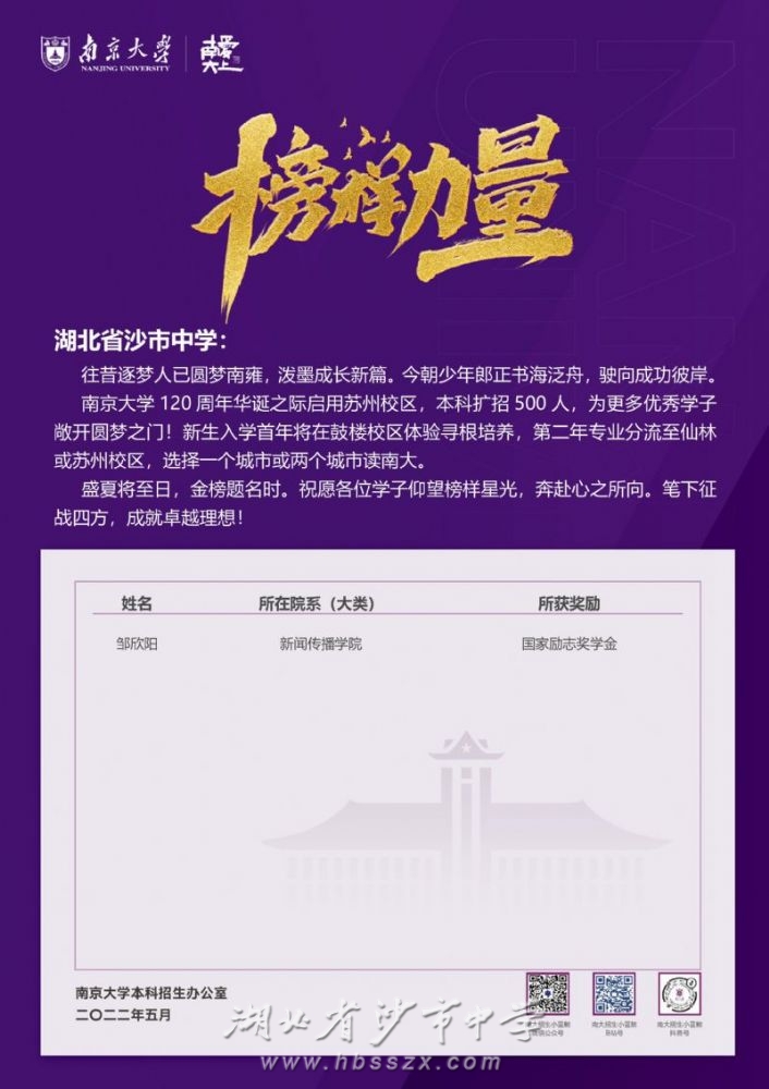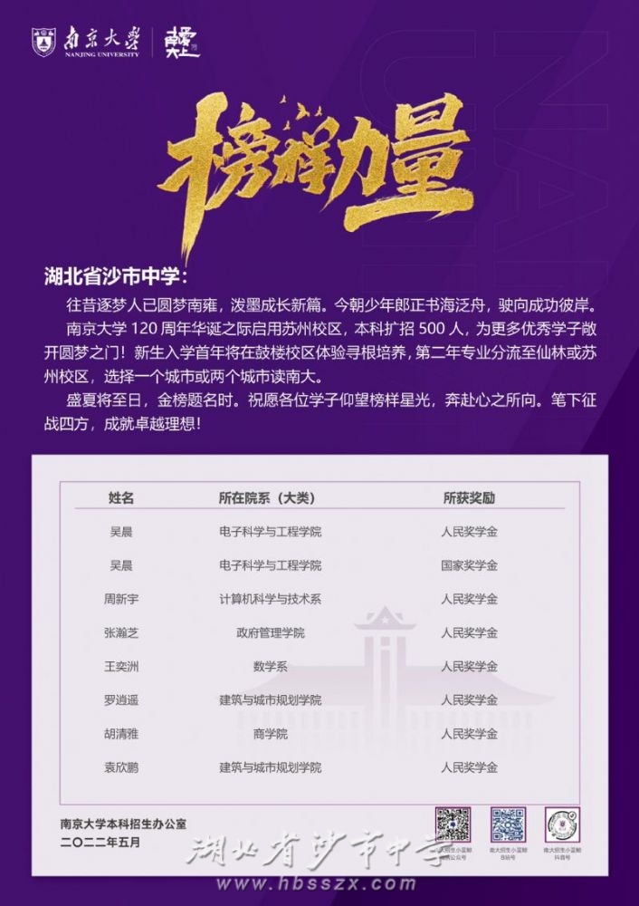 往昔逐夢人已圓夢南雍,潑墨成長新篇;今朝少年郎正書海泛舟,駛向成功彼岸。作為南京大學優質生源基地之一,“十三五”期間我校共有9人考入南京大學。他們在南京大學泛舟書海、卓然成長,成為兩校共同的驕傲和高中學子的榜樣力量。2021年,我校有1人考入南大,續寫兩校接力培養拔尖創新人才的傳奇。近日,南京大學向我校發來喜報,對我校多年來一直為南京大學輸送優質生源表示感謝,并預祝我校在2022年高考中再創佳績,期待更多沙市中學的學子金榜題名、啟航南大。