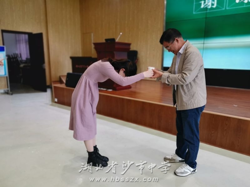 青年教師代表黃嘉懿敬上拜師茶 青年教師代表黃嘉懿虔誠地敬上拜師茶,深深鞠躬,指導老師丁家順鄭重接過拜師茶,亦是接過一份沉甸甸的責任。在這一俯一仰一送一迎之間凝聚的是尊師重道的佳風,堅守的是我校教師對教育事業薪火相傳的信念。