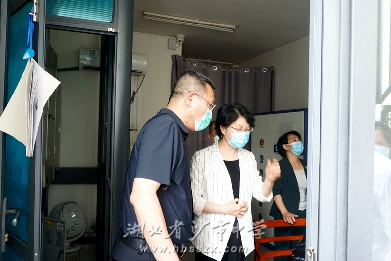 在沙市中學(xué)考點(diǎn),肖菊華一行沿著考生入場(chǎng)路線,實(shí)地檢查了測(cè)溫通道設(shè)置和設(shè)備運(yùn)行狀況。在東門保安室,副市長(zhǎng)嚴(yán)紅按下學(xué)校一鍵報(bào)警系統(tǒng),信號(hào)很快聯(lián)通了公安系統(tǒng),肖菊華表示滿意,并與日夜值守的安保人員親切交談。