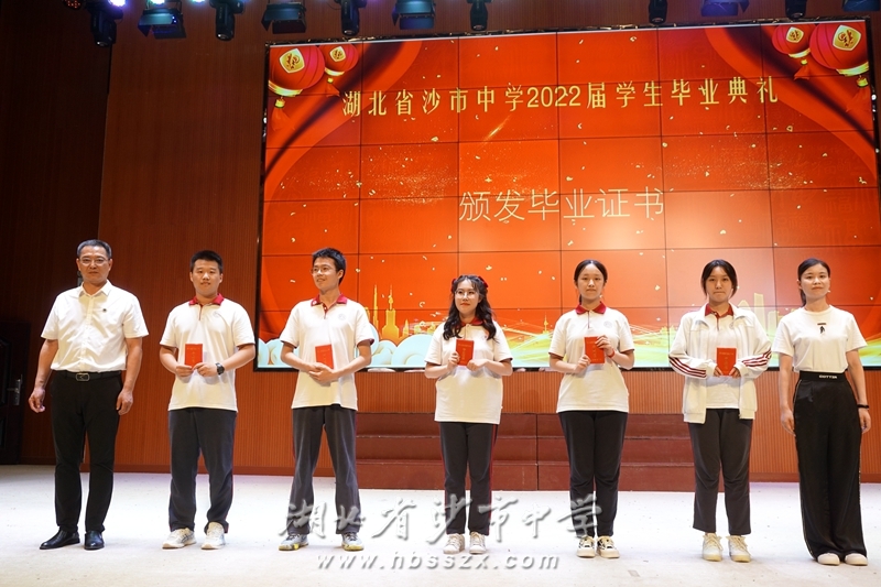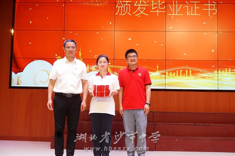 經歷了無數風雨,一路征戰,終見彩虹。在音樂伴奏下,各班班長在班主任陪同下依次上臺,從熊禮才校長手中接過畢業證。熊校長與他們一一握手并合影留念。熊校長還單獨向曾在學生會團委會工作過的高三學生頒發了畢業證,感謝他們為沙市中學做出了特別貢獻。