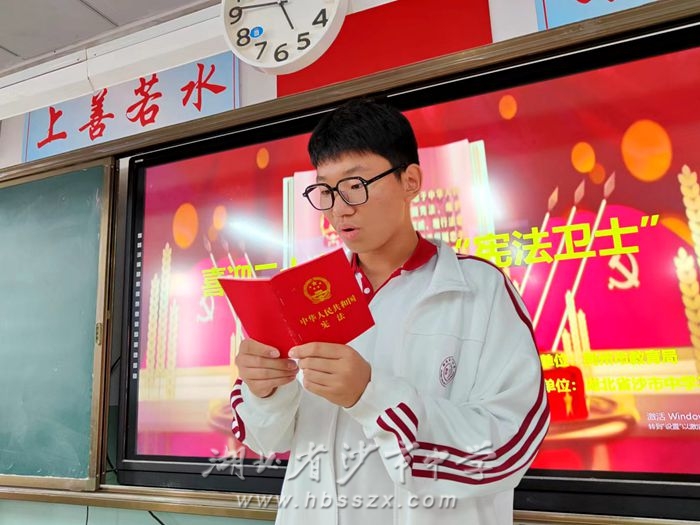 班會(huì)課上,各班班主任介紹了憲法基礎(chǔ)知識(shí),包括憲法的地位與作用、目的意義以及國(guó)家根本制度和根本任務(wù)等內(nèi)容,并帶領(lǐng)著同學(xué)們一起深入學(xué)習(xí)習(xí)近平法治思想。接著,由團(tuán)支書帶領(lǐng)同學(xué)們集體誦讀憲法序言,共同感受憲法的莊嚴(yán)與神圣。隨后,同學(xué)們還一起學(xué)習(xí)演唱了《憲法伴我們成長(zhǎng)》,在歌聲中播種下“學(xué)法、知法、懂法、守法”的種子。