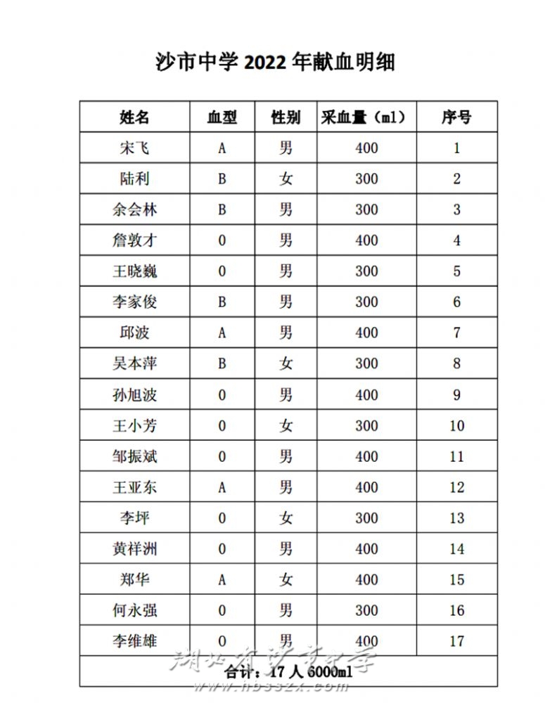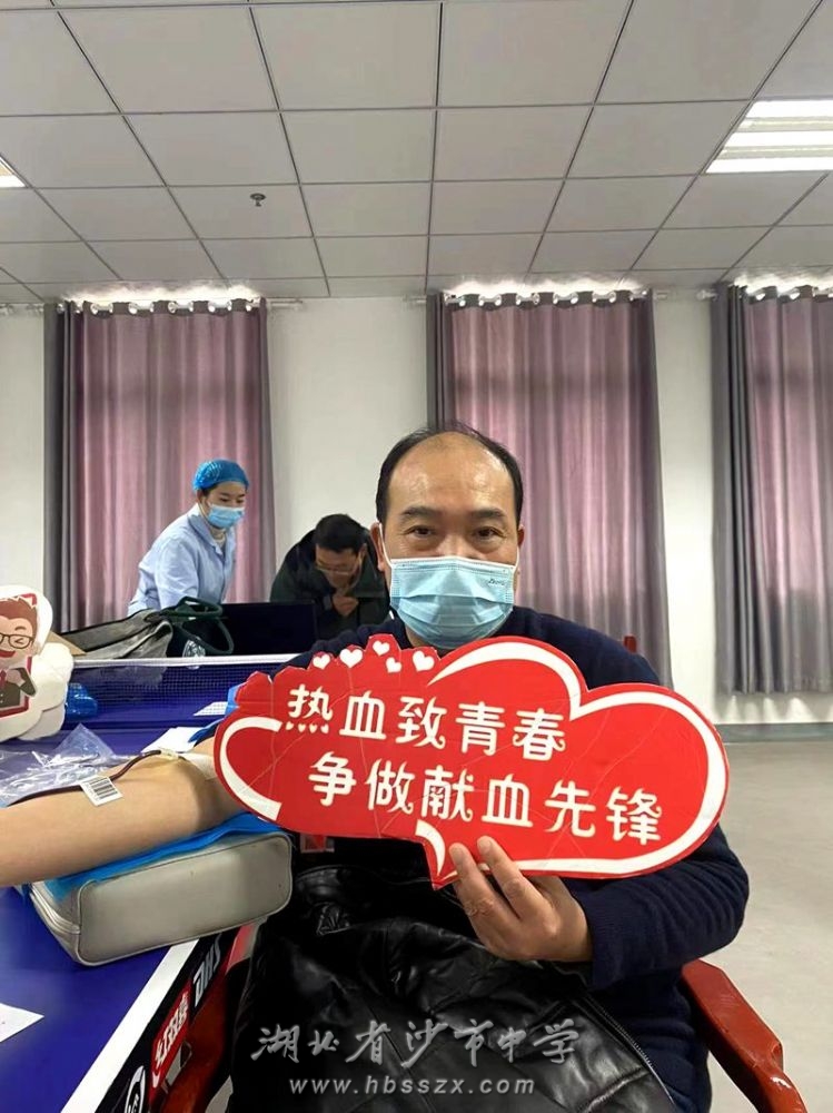 一直以來,沙市中學積極倡導身體條件合格的教職員工踴躍參與無償獻血,鼓勵教師們投身社會公益事業。每次獻血活動都得到教職工的積極響應,有的教師自參加工作到臨近退休,一直堅持無償獻血,總獻血量已經達到數千毫升。