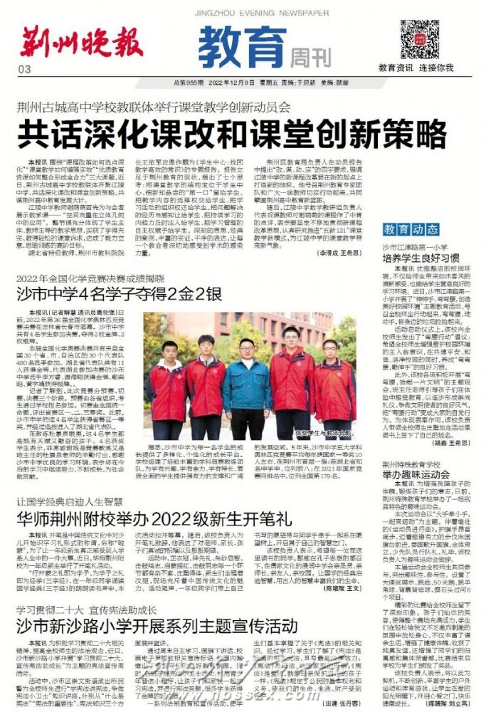 《荊州晚報》2022年12月9日報道我校化學競賽取得優異成績