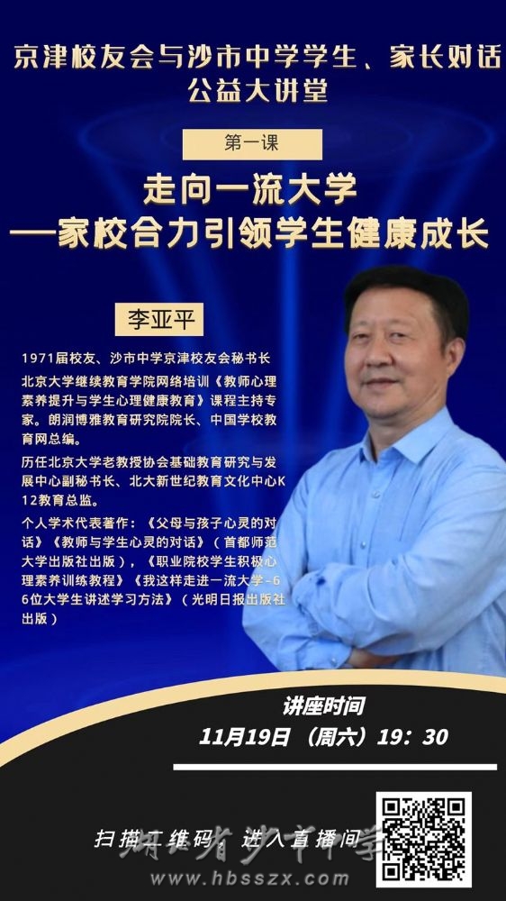 第一課:11月19日,沙市中學(xué)1971屆校友、京津校友會(huì)秘書長(zhǎng)、北京大學(xué)繼續(xù)教育學(xué)院專家、朗潤(rùn)博雅教育研究院院長(zhǎng)、中國(guó)學(xué)校教育網(wǎng)總編李亞平