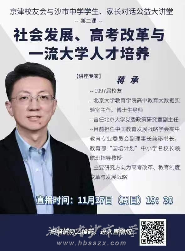 第二課:11月27日 ,沙市中學(xué)1997屆校友、北京大學(xué)教育學(xué)院博導(dǎo)蔣承
