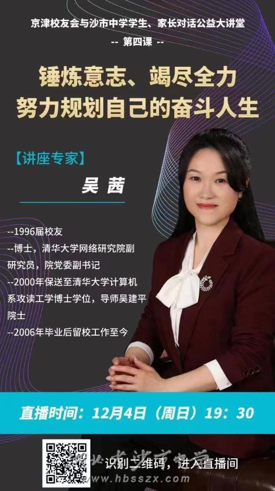 第三課:12月4日,沙市中學(xué)1996屆校友、清華大學(xué)網(wǎng)絡(luò)研究院黨委副書記吳茜