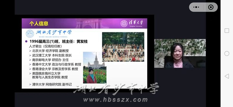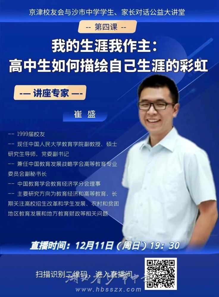 為了豐富沙市中學(xué)校慶日的文化與教育內(nèi)涵,協(xié)助母校辦好家長(zhǎng)學(xué)校,提升家長(zhǎng)與學(xué)生素質(zhì),引領(lǐng)更多的學(xué)弟學(xué)妹走進(jìn)一流大學(xué),從11月19日到12月17日,沙市中學(xué)京津校友會(huì)邀請(qǐng)了部分在北京著名高校工作的校友,利用周末時(shí)間舉行了線上“與母校家長(zhǎng)學(xué)生對(duì)話系列公益大講堂”活動(dòng)。