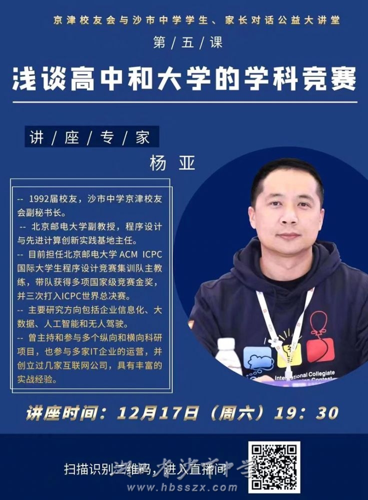 第五課:12月17日,沙市中學(xué)1992屆校友、北京郵電大學(xué)程序設(shè)計(jì)與先進(jìn)計(jì)算創(chuàng)新實(shí)踐基地主任楊亞