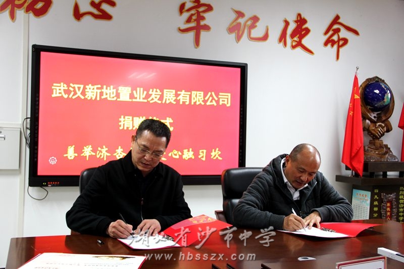 儀式最后,熊禮才校長(zhǎng)代表沙市中學(xué)與劉創(chuàng)簽署捐贈(zèng)協(xié)議,劉創(chuàng)校友代表武漢新地置業(yè)發(fā)展有限公司向沙市中學(xué)教育發(fā)展基金會(huì)捐贈(zèng)100萬(wàn)元。熊禮才為劉創(chuàng)頒發(fā)了捐贈(zèng)證書(shū)。