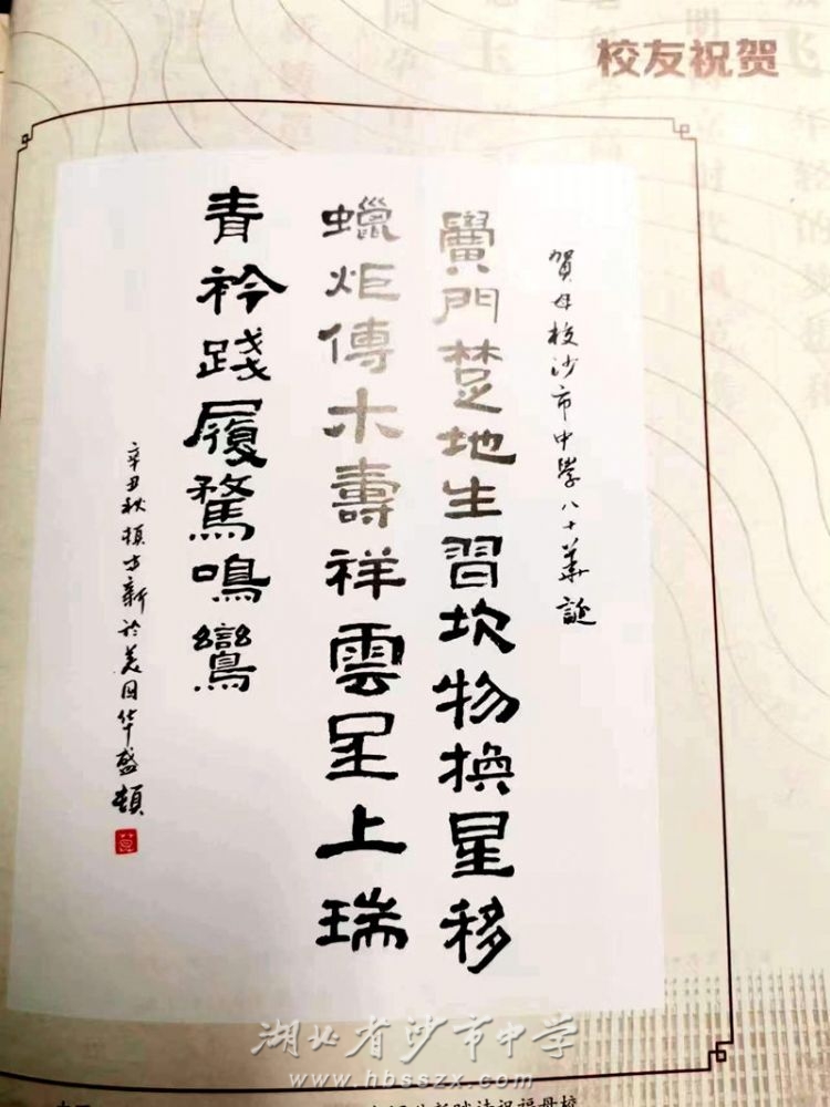 在熊禮才校長的陪同下,頓世新一行首先來到沙市中學校史館參觀。看到記錄母校歷史沿革的舊照片,看到習坎樓奠基石,頓世新感慨萬千,他回想起當年求學的經歷,歷數曾經教育和引導他的老師。在沙市中學80周年校慶紀念展品前,頓世新分享了他當時呈上的書法作品的創作心得。2021年11月,在學校校慶日到來之前,身處美國的頓世新賦詩一首:黌門楚地生習坎,物換星移蠟炬傳。木壽祥云呈上瑞,青衿踐履騖鳴鸞。他還揮筆潑墨,撰寫成幅,以視頻方式傳至母校,表達對母校生日的誠摯祝福。