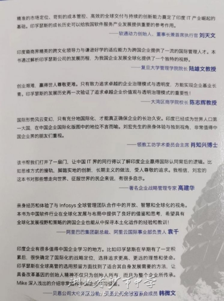 書籍推薦語 劉宏校友1981年畢業于湖北省沙市中學,被中國人民大學信息學院錄取,到美國邁阿密大學商學院攻讀工商管理碩士,后來完成美國斯坦福大學企業高管培訓。2013年劉宏先生加入印度著名的信息技術服務公司印孚瑟斯(Infosys)中國有限公司擔任首席運營官,并于2016年榮升全球副總裁兼大中華地區總裁及法人。在印孚瑟斯任職期間,劉宏先生全面負責推動印孚瑟斯中國業務轉型,為跨國公司中國戰略落地及中國企業海外拓展提供一流的業務咨詢及IT服務。在此期間,劉宏先生曾多次與公司創始人、全球CEO及公司高級管理人員緊密交流,成為第一個擔任印孚瑟斯大中國地區業務總裁兼法人職務的大陸人士。