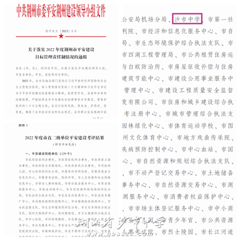 沙市中學(xué)榮獲"2022年度荊州市平安建設(shè)優(yōu)勝單位"稱號