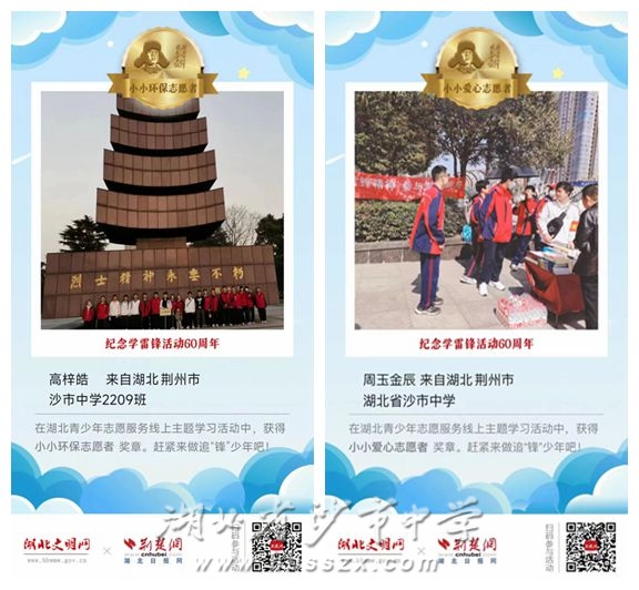 在湖北省文明辦、省教育廳、省團委的號召下,我校全體學生參加了2023年《讓我們一起做追‘鋒’少年!》的志愿服務線上主題學習活動?;顒又?,同學們認真學習志愿服務相關知識,并結合實際,選擇自己喜歡或參與過的志愿服務項目,曬出自己參與志愿服務的照片,獲得專屬的志愿者徽章。