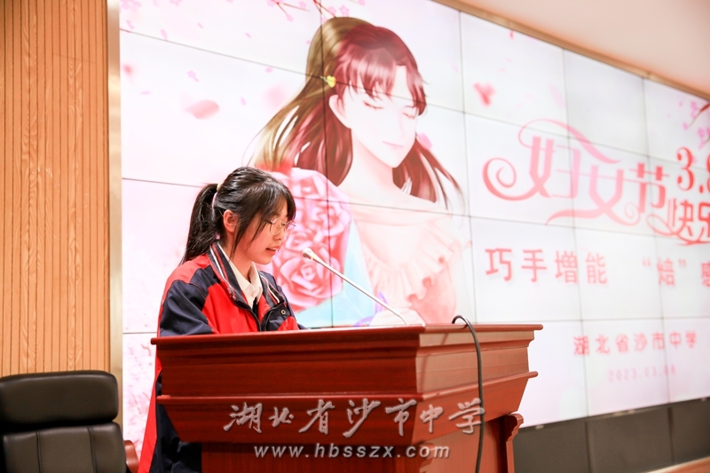 高二(17)班韓若冰同學為女教師們送上贊詞。她說:“在你們身上,被生活貼滿了各色各樣的標簽,母親,女兒,妻子,師長,但你們只是默默張開雙臂,撐起一道黎明的霞光,撐起半邊遼闊的蒼穹,撐起頭頂一片燦爛而輝煌的星空?!?br />