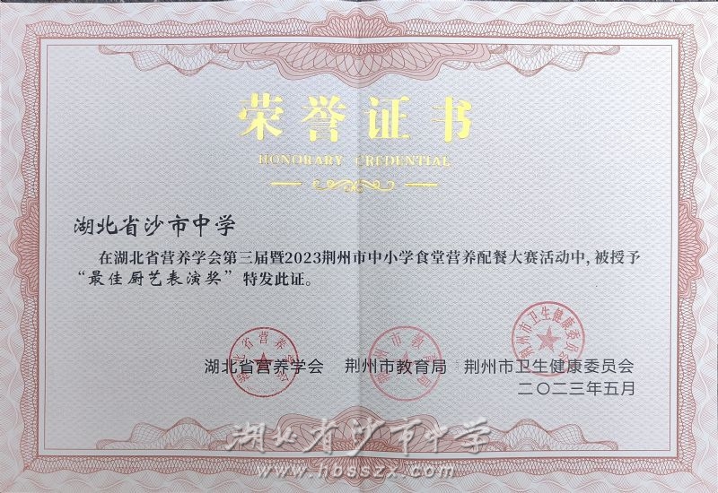 5月28日上午,湖北省營養(yǎng)學(xué)會(huì)第三屆暨2023荊州市中小學(xué)食堂營養(yǎng)配餐大賽在長江大學(xué)文理學(xué)院新校區(qū)舉行,沙市中學(xué)食堂代表隊(duì)由副校長唐年新領(lǐng)隊(duì),食堂經(jīng)理黃大源,主廚羅超等七人參加此次比賽,在31支中小學(xué)代表隊(duì)中我校經(jīng)過精心準(zhǔn)備,激烈競(jìng)爭(zhēng),獲得高中組營養(yǎng)配餐一等獎(jiǎng),最佳廚藝表演獎(jiǎng),此次比賽鞏固提升了我校食堂服務(wù)保障能力,以賽帶學(xué)、以賽促練、以賽代訓(xùn),提高了我校食品安全和營養(yǎng)健康水平,學(xué)生們吃得營養(yǎng)、健康、安全、放心。