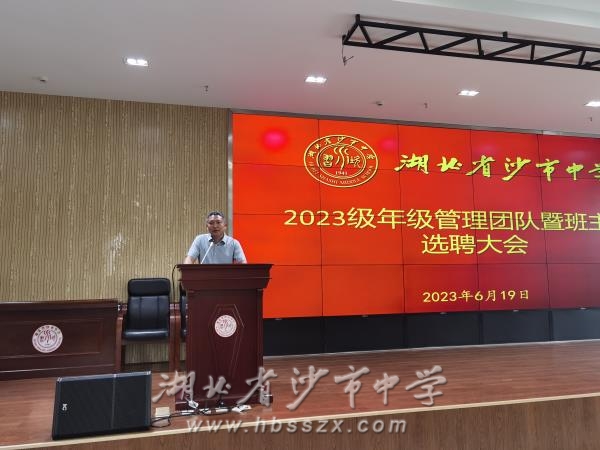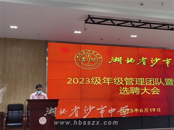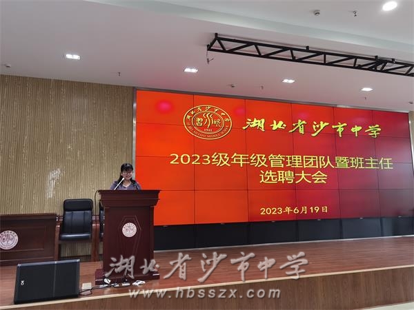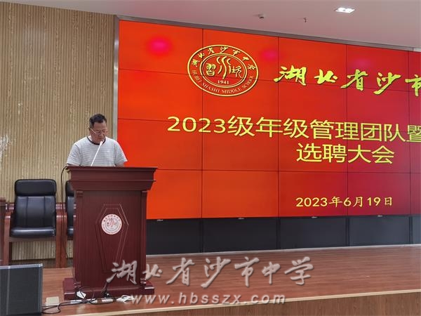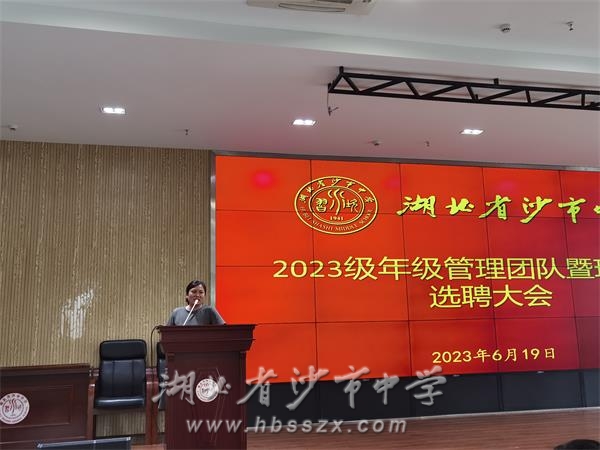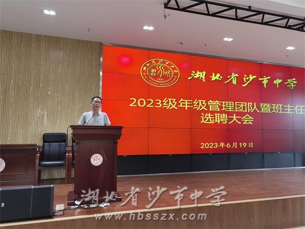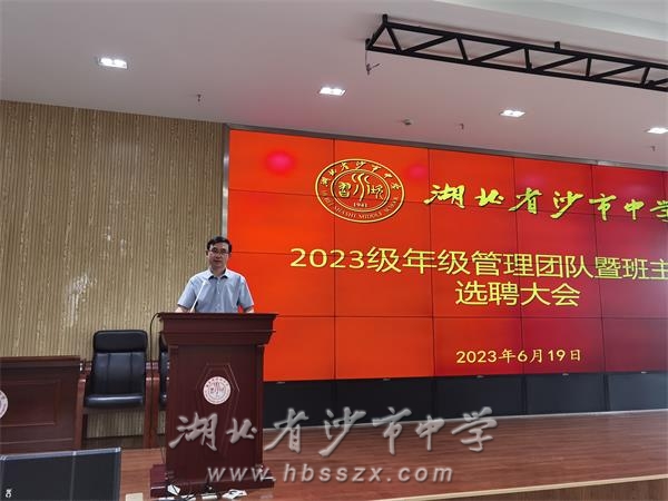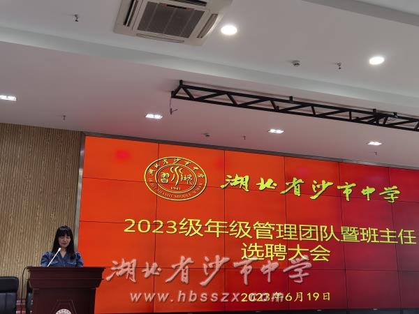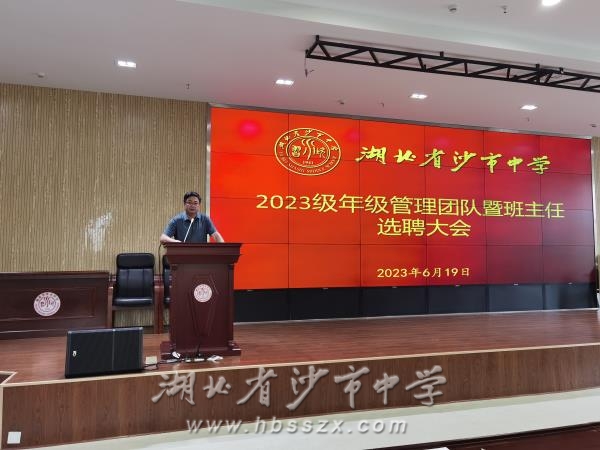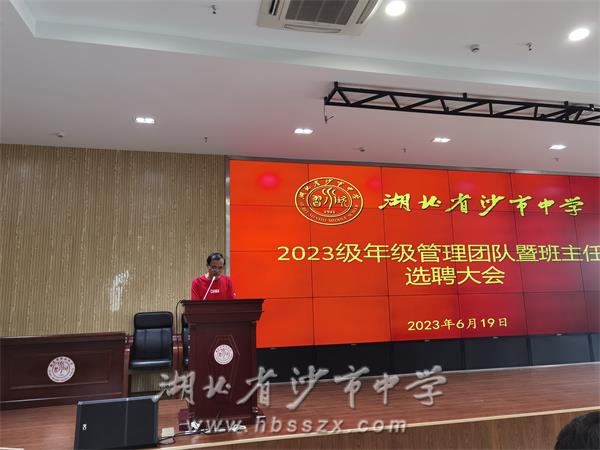 6月19日下午,沙市中學2023級年級管理團隊、班主任選聘大會在綜合樓二樓會議室召開。2023級年級組長候選人、班主任候選人依次登臺發表競職演講。學校黨委成員和2023級全體教師參加會議。學校黨委委員、副校長唐年新主持會議。
