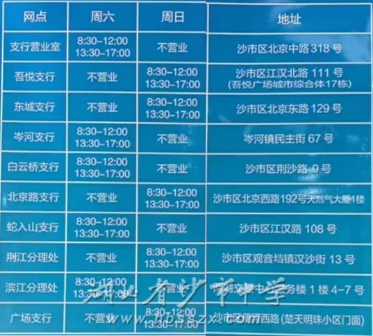 沙市區農業銀行網點為農行荊州北京路支行(沙市區三岔路天然氣大廈旁。電話:0716-8214658、0716-8223349)、沙市支行營業部(沃爾瑪隔壁)、東城支行(三醫對面)、蛇入山支行(蛇入山公園對面)、濱江支行(兩湖市場)、白云支行(北湖路)、荊江支行(觀音垱鎮)、洪城支行(吾悅廣場)、岑河支行(岺河鎮)、廣場支行(便河西)。農行可以辦理的網點具體地址和營業時間附后。