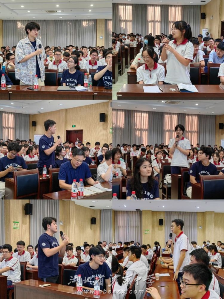 交流互動環節 接著,北大光華管理學院楊安妮、肖博瀚、谷俊億、孫宇陽、趙鎏瑋、岳韻嘉等六名優秀學子分別上臺交流高考備考心得。他們或是圖文并茂地介紹北大豐富的活動、誘人的美食、幽靜的風景,向在座學子發出“歡迎來北大”的號召,激發其高考備考內驅力;或是結合自身備考經歷,給出高三臨考沖刺的針對性建議,幫助在座學生進一步明確學習目標,科學規劃人生;或是風趣幽默,妙語連珠,贏得滿堂喝彩;或是嚴謹縝密,有條不紊,引導深入思考。在交流互動環節中,同學們踴躍提問,北大學子們詳細解答,每一次互動,都閃爍著學習熱情和學習潛力被激發后的思維火花,都凝聚著向著目標不斷前行的澎湃力量。