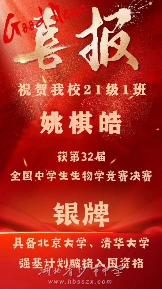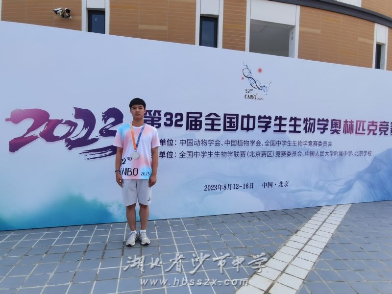 2023 年 8月16日,第32屆全國中學生生物學競賽決賽在北京落下帷幕,來自全國各省的555名參賽選手同臺競技,我校2101班姚棋皓同學作為湖北代表隊隊員斬獲銀牌,同時獲得北京大學、清華大學強基計劃破格入圍資格。