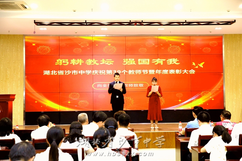 青年教師張盼、周敏擔任主持人 躬耕教壇,強國有我。9月8日下午,沙市中學慶祝第39個教師節(jié)暨年度表彰大會在綜合樓報告廳舉行,學校領導及全體教職工參加大會,荊州市延安精神研究會會長、原荊州市人大常委會副主任、沙市中學荊沙校友會第一屆會長、沙市中學71屆校友幸正榮,湖北達雅生物科技股份有限公司董事長徐振明,原沙市區(qū)副區(qū)長、沙市中學81屆校友李彬,湖北新地投資集團有限公司執(zhí)行董事、沙市中學85屆校友劉劍,深圳市華訊方舟集團有限公司高級副總裁、沙市中學87屆校友項俊暉,沙市中學813獎學金秘書長、沙市中學81屆校友熊克誠,沙市中學教育發(fā)展基金會理事長曹光炎等應邀出席大會。