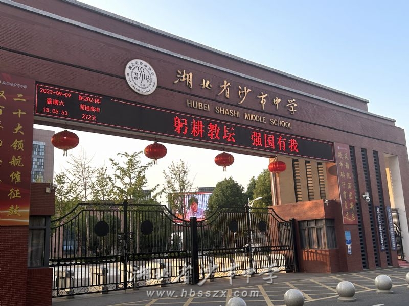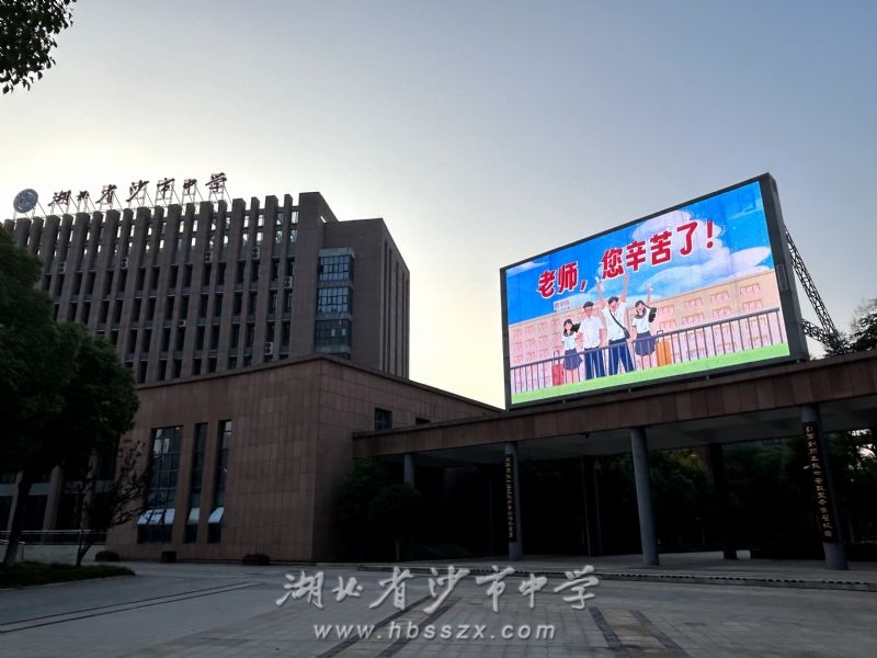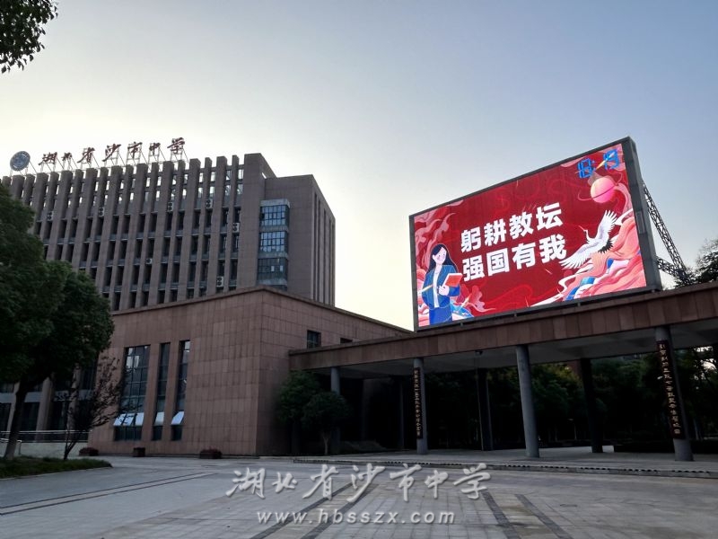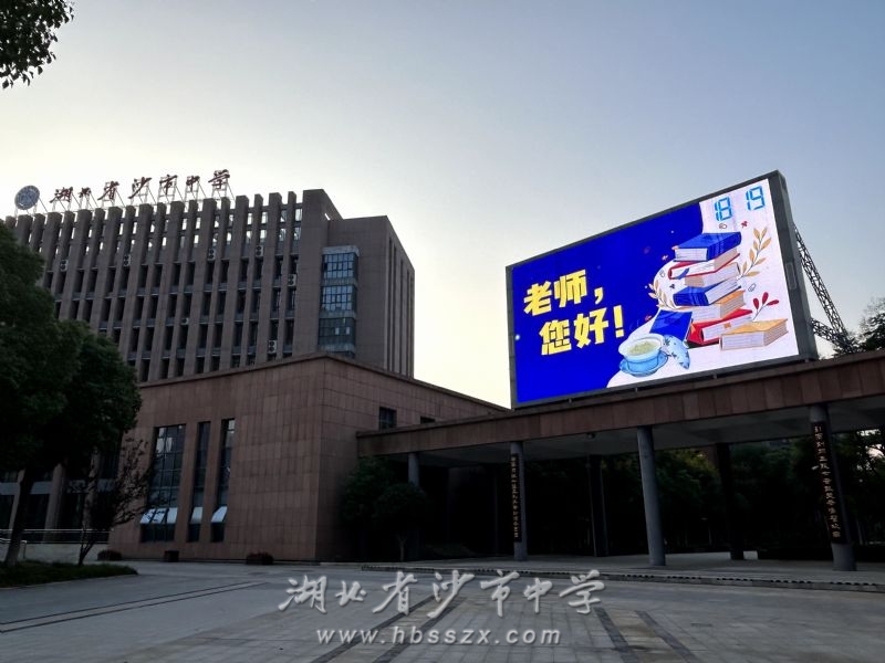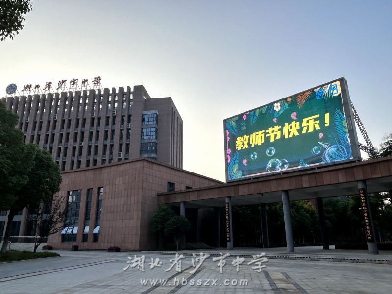 根據(jù)上級(jí)教育主管部門荊州市教育局的統(tǒng)一安排并結(jié)合本單位實(shí)際,沙市中學(xué)將于9月9日、10日、11日連續(xù)三晚的黃金時(shí)間在學(xué)校主體建筑至善樓(綜合樓)旁的大型 LED 全彩屏上播放內(nèi)容為“躬耕教壇,強(qiáng)國(guó)有我”、“老師,您好!”、“老師,您辛苦了!”、“教師節(jié)快樂(lè)!”等的海報(bào)圖片,同時(shí)全天在學(xué)校東門門樓、南門門樓的大型 LED 文字屏上滾動(dòng)顯示上述文字內(nèi)容。學(xué)校期望以此形式為教師"亮燈",隆重慶祝第三十九個(gè)教師節(jié)的到來(lái)。