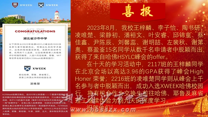 今年8月,我校王梓麟、李子怡、陶書研、凌唯楚等15名同學從數千名申請者中脫穎而出,獲得了來自哈佛HSYLC峰會的邀請。在九天的學習活動中,2117班的王梓麟同學在北京會場以高達3.96(滿分為4)的GPA獲得了峰會榮譽HIGH HONORS;2216班的凌唯楚同學則從峰會上千名參與者中脫穎而出,成功入選XWEEK哈佛校園行,將有機會作為交換生前往哈佛、耶魯及麻省理工繼續體驗為期九天的深度學習。