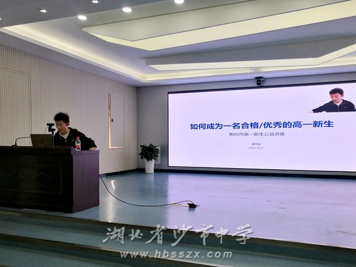 為提升學校家庭社會協同育人水平、助力高一新生健康成長,10月21日下午,由荊州市教育局舉辦的“2023·高一師生家長輔導講座”在市教育局五樓會議室召開。本次活動以《奮進吧,新時代的我們》為主題,采用“線上+線下”的模式,面向全市高一師生和家長開放。沙市中學黨委委員、副校長胡直帶隊高一年級班主任代表和20位學生家長代表出席了本次活動,其他師生家長則通過線上觀看講座。