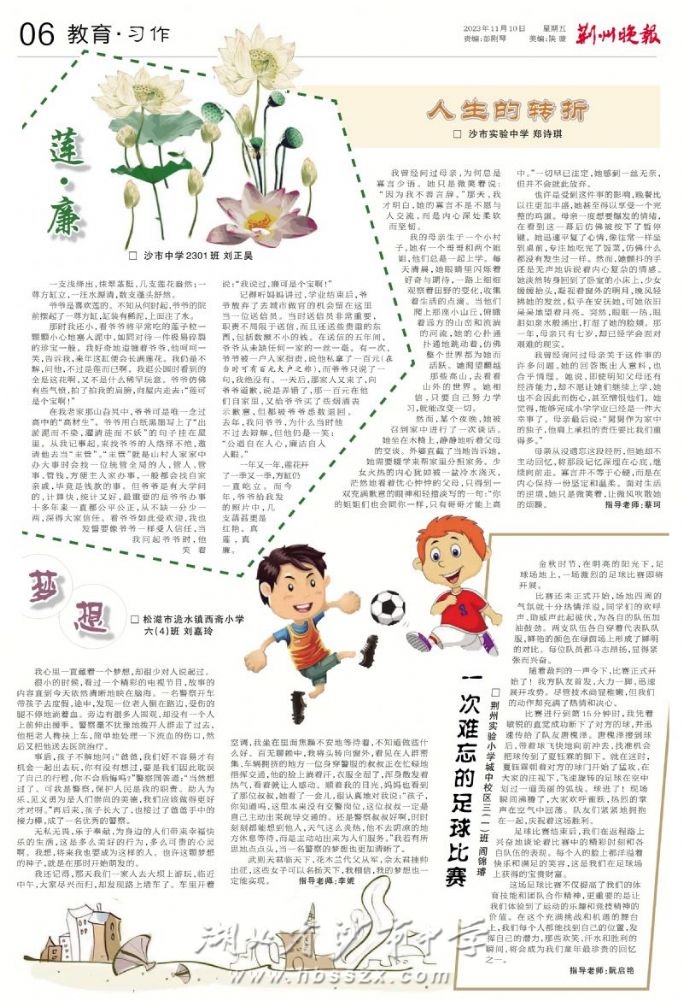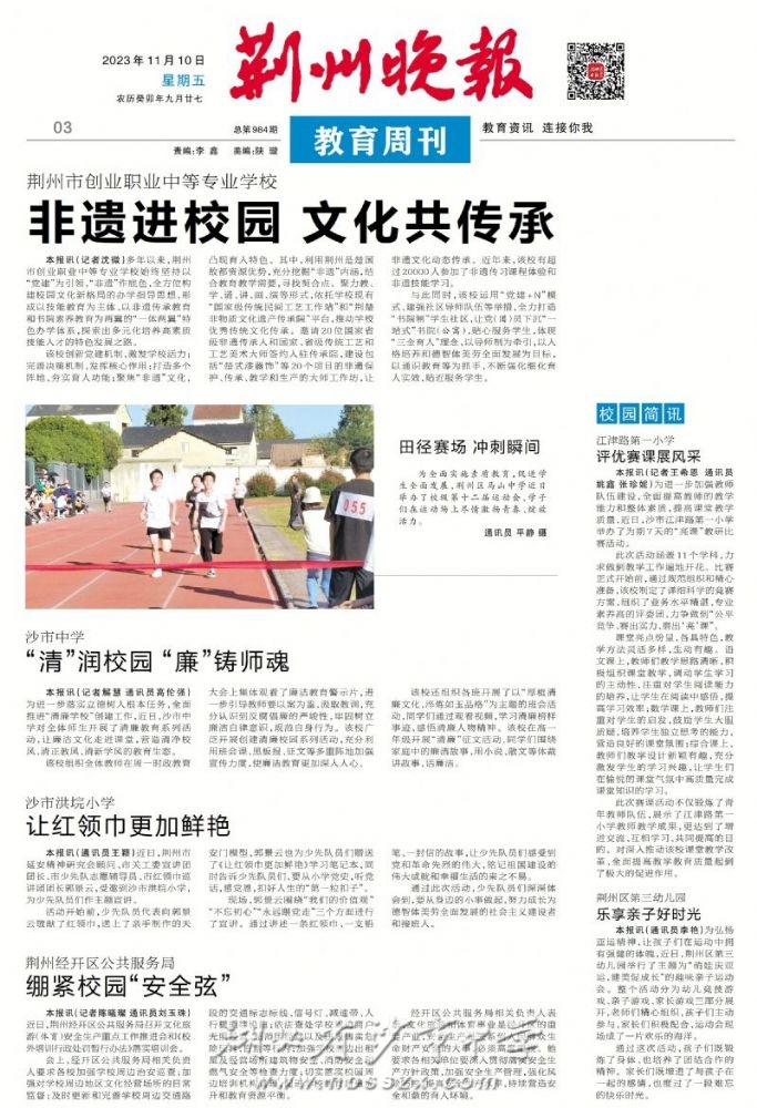 《荊州晚報》2023年11月10日報道我校舉行創建"清廉校園"系列活動并刊登"清廉"征文獲獎作品