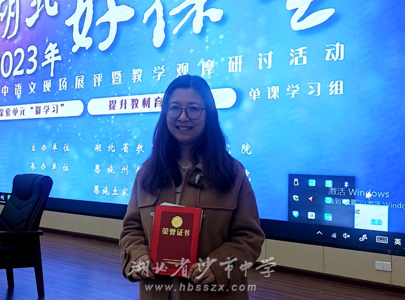 楊微老師 11月10日,我校語文教研組楊微老師在2023年“湖北好課堂”高中語文現場展評活動中,與來自華師一附中、黃岡中學、襄陽五中、恩施高中等全省知名高中的18名教師同臺競技,脫穎而出,喜獲一等獎。