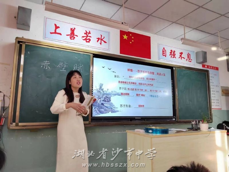 授課現場 語文觀摩課由沙市中學高一語文組教師江露露執教,課題為《赤壁賦》。本堂課以《赤壁歌》導入,從所見、所聞、所悟三方面分析蘇子“游賞者、失意者、超脫者”的形象和“變”與“不變”的人生哲理,并結合蘇軾其他詩篇,引導學生分析蘇軾成仙的心路歷程,最后播放《感動中國年度人物》視頻,引發學生對“面對人生困境,如何完成現實中的‘突圍’”這一問題的思考。