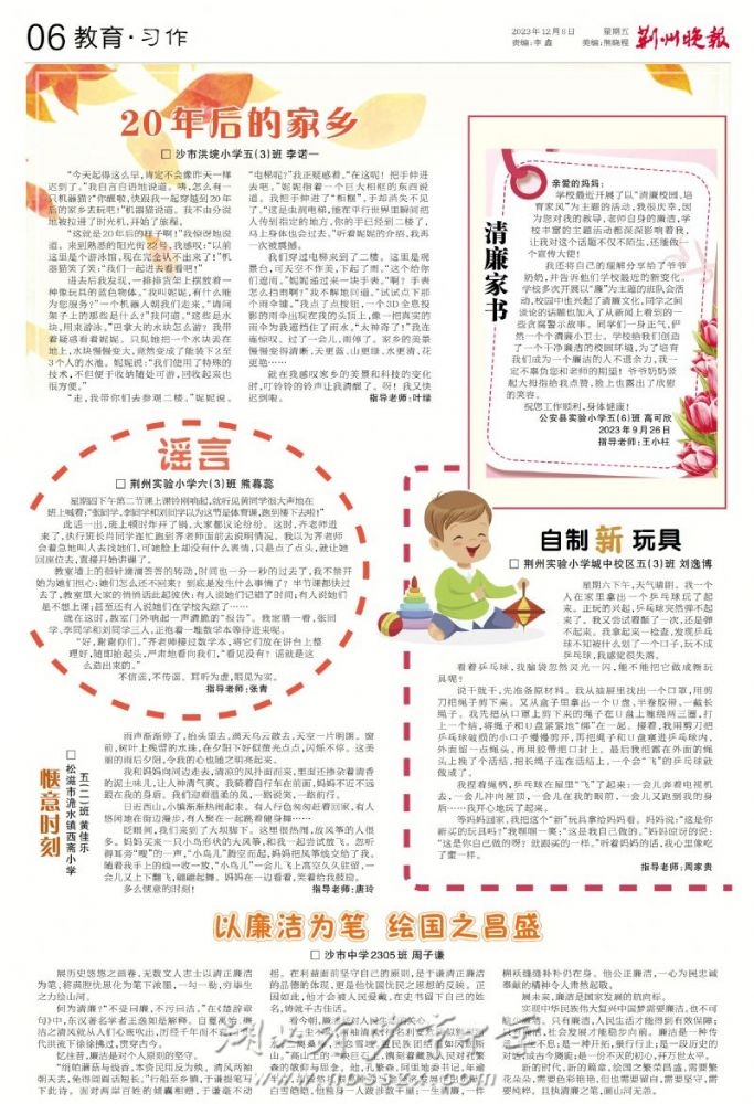 《荊州晚報》2023年12月8日刊登我校"清廉校園"建設征文獲獎作品