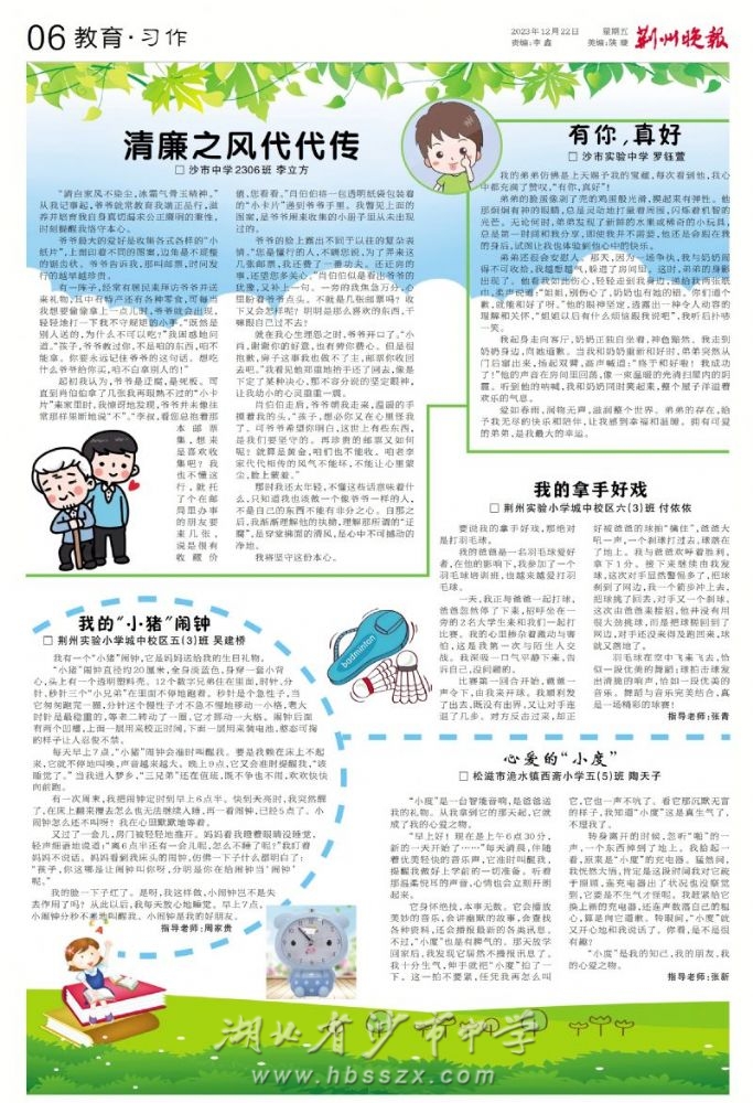 《荊州晚報》2023年12月22日刊登我校"清廉校園"建設征文獲獎作品