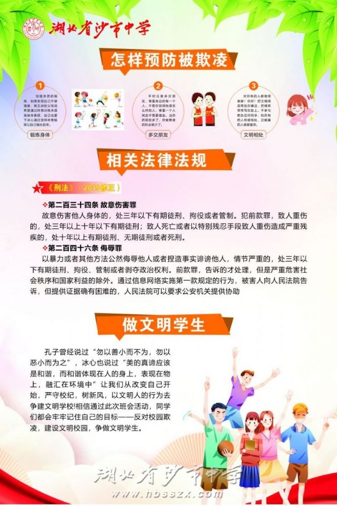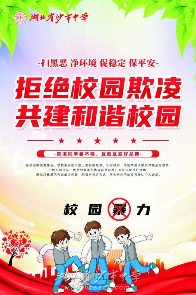 從校園欺凌的表現形式、如何預防校園欺凌、避免成為校園欺凌目標、拒絕成為冷眼旁觀者、遇到時如何應對等方面對學生進行教育,同時用鮮明的事例警醒學生預防校園欺凌引導和鼓勵同學們在日常生活中自覺抵制校園欺凌,既不能做校園欺凌者,也不能做校園欺凌的旁觀者,更要避免成為校園欺凌的受害者,在關鍵時刻要拿起法律的權杖勇敢地捍衛自身的合法權益,大聲地向校園欺凌說“不”。