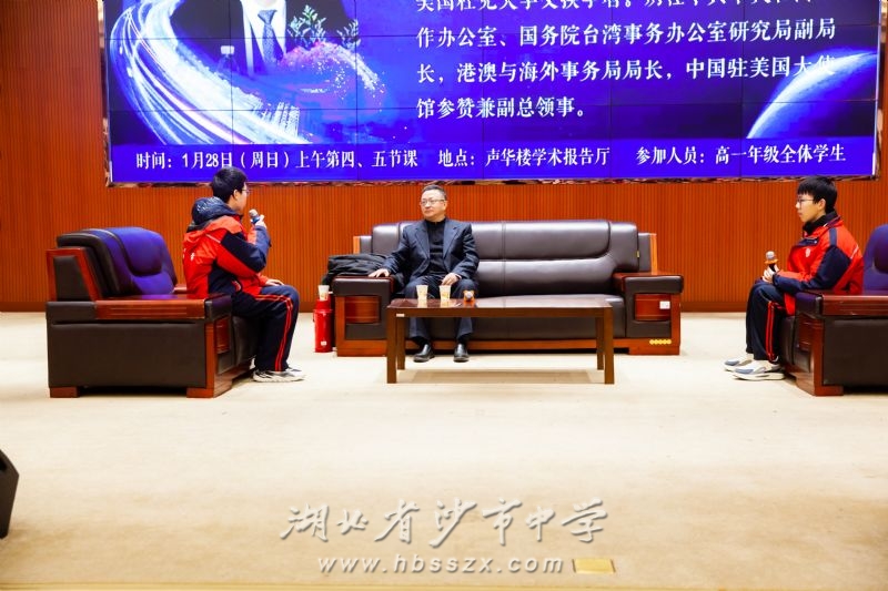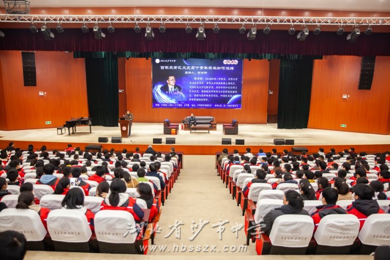 沙市中學1981屆校友頓世新主講 本次講座分為嘉賓主講和學生提問兩個環節。頓世新首先解釋了“百年未有之大變局”的含義,在講解過程中回溯歷史,引經據典,借用專家解讀并融入自己的見解,結合“上善若水”的習坎文化講述從“競爭”到“不爭”的轉變,深入淺出,妙語連珠,幽默風趣的語言風格、真情流露的說話藝術引得現場掌聲連連,充分顯示了其寬廣的歷史視野和深厚的文化底蘊。