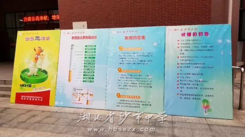 沙市中學一直以來非常重視校園控煙工作,學校成立控煙領導小組,并把控煙工作納入學校總體工作計劃。在學生教育方面,通過黑板報、班會、國旗下講話、手抄報等多種形式開展禁煙宣傳,利用圖片、視頻、真實事例等方式向同學們介紹世界無煙日的來歷、吸煙的危害、戒煙的簡單方法等知識。讓學生深刻認識到吸煙的嚴重危害性,從而牢固樹立禁煙意識,拒吸第一支煙。在教職工控煙方面,學校在教學樓和辦公區設置大量的禁煙標志,并通過全校大會向全體教職工發出倡議,要求教師做學生行為的表率和示范,以身作則,起到榜樣帶頭作用,共同維護校園清新健康的無煙環境。