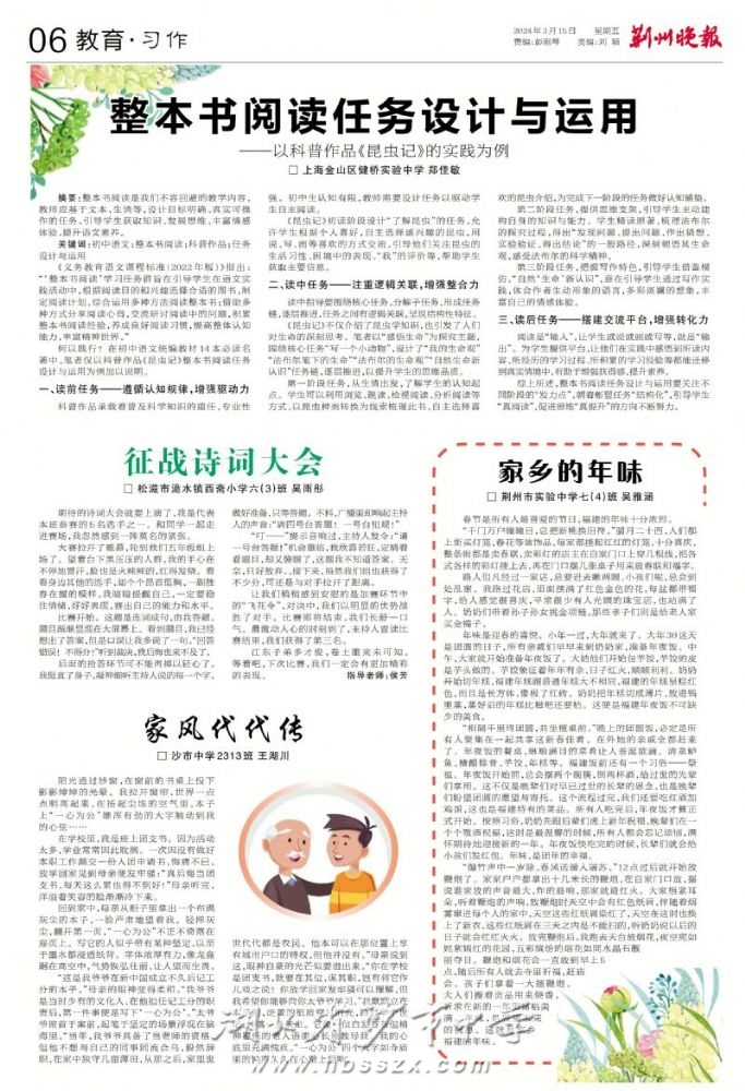 《荊州晚報》2024年3月15日發表我校"清廉校園""建設征文獲獎作品"