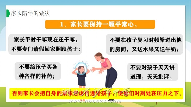 王里老師建議家長們:1、要對孩子有信心,相信孩子能取得預期成績;2、對孩子的期望要合理,可以緩解學子的考試壓力;3、對老師有信心,信任老師;4、家長要保持一顆平常心,為孩子營造寬松自然愉快的家庭氛圍,保持孩子心境平和。