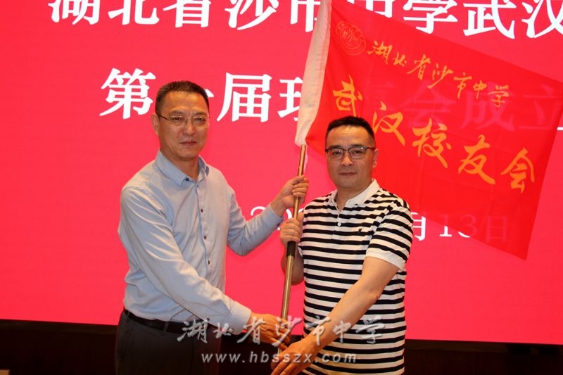 沙市中學(xué)黨委書記熊禮才(左)向武漢校友會授旗