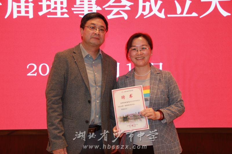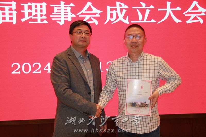 沙市中學(xué)黨委副書記、校長徐善慧(左)向第一屆理事會成員頒發(fā)聘書