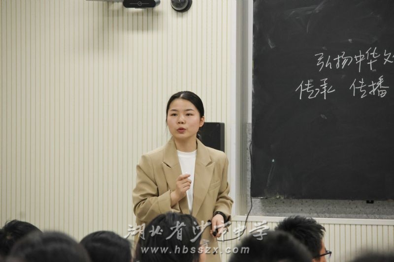 沙市中學王穎捷老師賽課 王穎捷老師的班團課共分為三個版塊:傳承、傳播和創新。課堂先以沅陵龍舟賽進行導入,引導學生發現身邊的中華文化,接著以飛花令的形式調動課堂氣氛,再通過觀看視頻、猜燈謎、小組討論等活動,讓學生領會到中華文化的博大精深,并思考如何弘揚中華文化。最后,在手藝體驗館環節中,小組成員分別抽取錦囊進行手工實踐并分享感受。