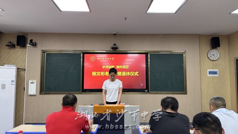 5月7日上午,沙市中學為教師鮑文彬舉行榮譽退休儀式,辦公室副主任李燕成主持,沙市中學黨委委員、副校長唐年新、辦公室主任張珺、工會代表張亞及全體體藝中心教師參加。