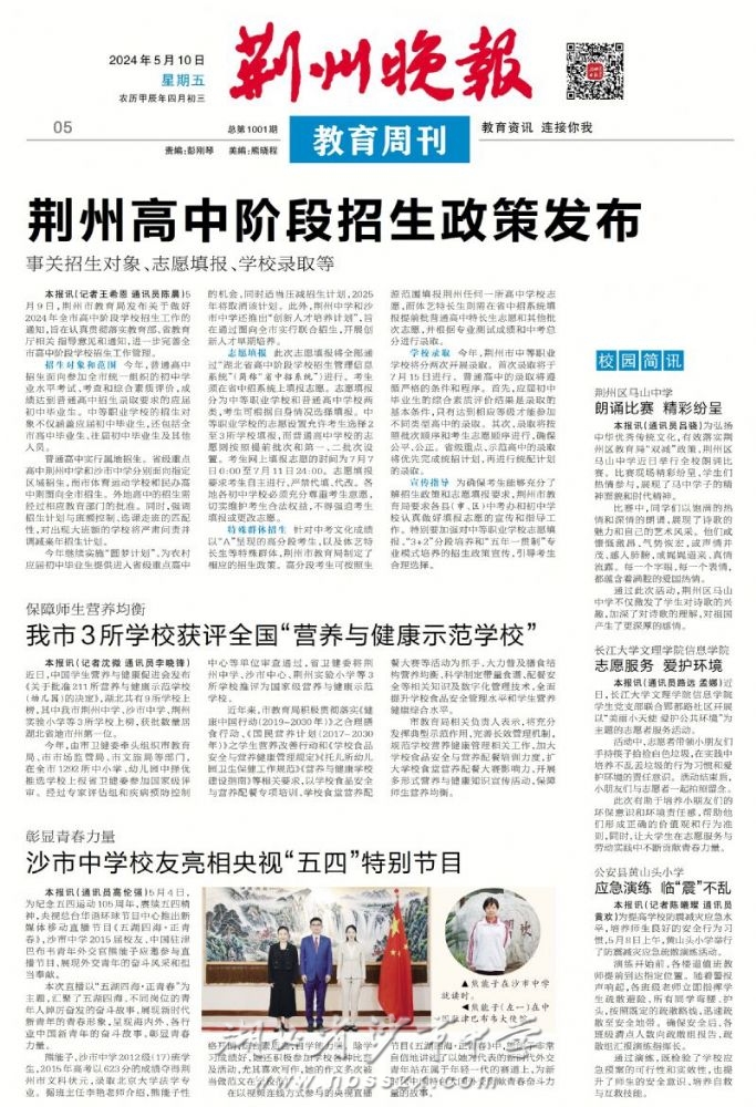 《荊州晚報》2024年5月10日報道我校校友亮相央視"五四"特別節目