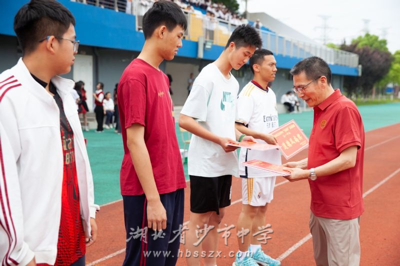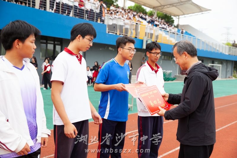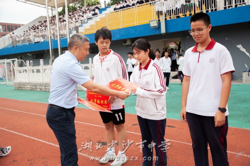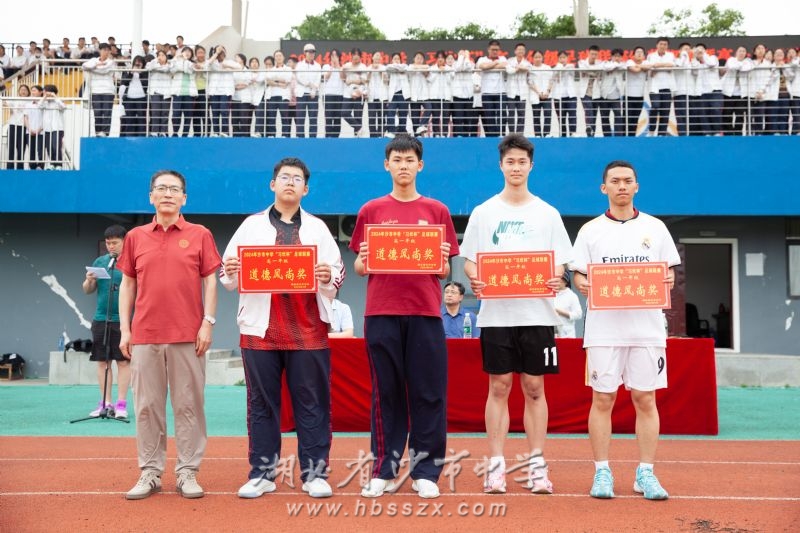 獲得比賽道德風尚獎的班級是高一(12)班、高一(15)班、高一(9)班、高一(5)班,副校長胡直為獲獎班級頒獎。