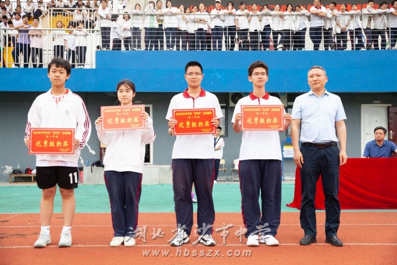 接下來進行頒獎儀式,獲得優秀組織獎的班級是高一(16)班、高一(3)班、高一(8)班、高一(4)班,副校長唐年新為獲獎班級頒獎。