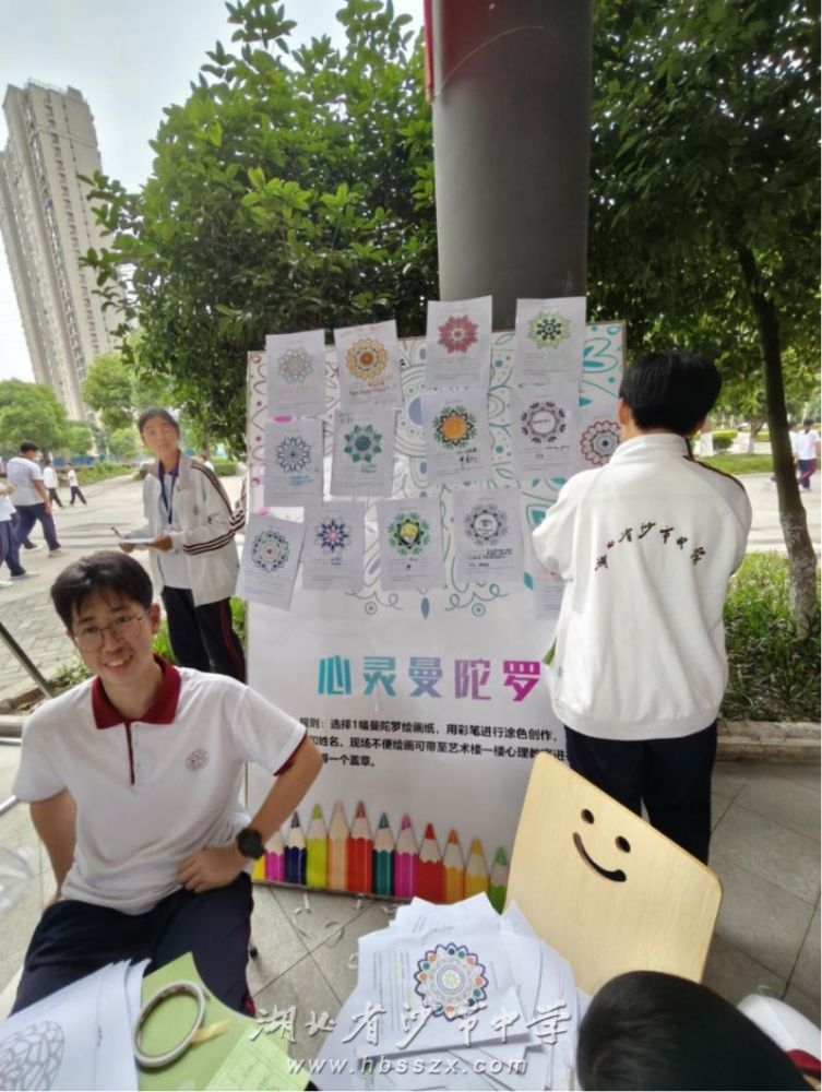 第二區(qū)域,情緒體驗區(qū)。該區(qū)域有解憂雜貨鋪、情緒撕紙、曼陀羅繪畫三個項目。學生們在這些活動中,化身朋輩支持的高手,幫助同學們解決一個又一個的煩惱。在撕紙環(huán)節(jié),合理宣泄自己的情緒,保留自己幸福的瞬間。曼陀羅繪畫將藝術于心理相結合,讓學生體驗不一樣的情緒療愈方法。有效的幫助學生更好的認知情緒、接納情緒、調節(jié)情緒。