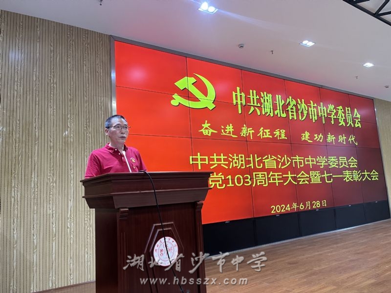 為慶祝中國共產黨成立103周年,教育引導全校黨員干部深入學習貫徹習近平新時代中國特色社會主義思想,深入學習黨的光輝歷史,汲取前進動力,在推進學校高質量發展中勇挑重擔、勇當先鋒,沙市中學6月28日舉行慶祝中國共產黨建黨103周年活動,召開“兩優一先”表彰大會。