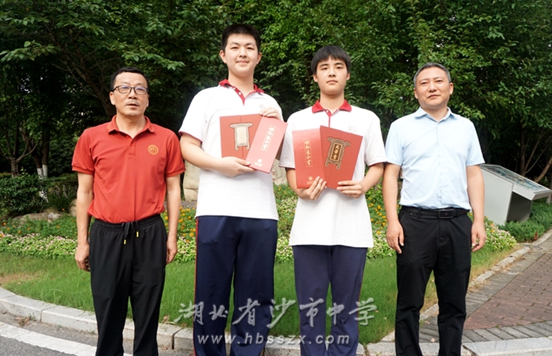 兩位同學(xué)與班主任肖述友(左一)和學(xué)校黨委委員、副校長(zhǎng)唐年新(右一)合影 7月15日,對(duì)于沙市中學(xué)的2101班的劉小康、姚棋皓來(lái)說(shuō)是一個(gè)意義非凡的日子。下午5:00,中國(guó)郵政集團(tuán)有限公司荊州市分公司的攬投員將兩份北京大學(xué)錄取通知書分別送到了在沙市中學(xué)等候的兩位學(xué)子手中。